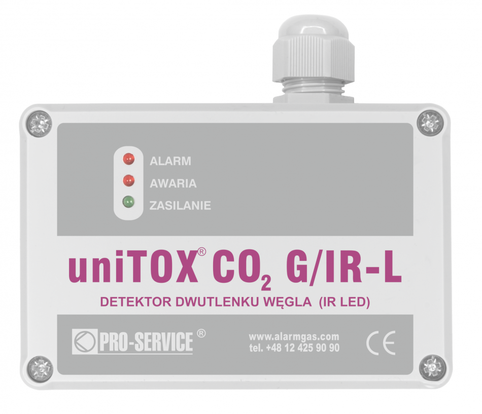 - uniTOX.CO2 G /IR-L/D – detektor z czujnikiem infrared LED, wyjścia alarmowe A1/A2 typu OC-NC lub OC-NO