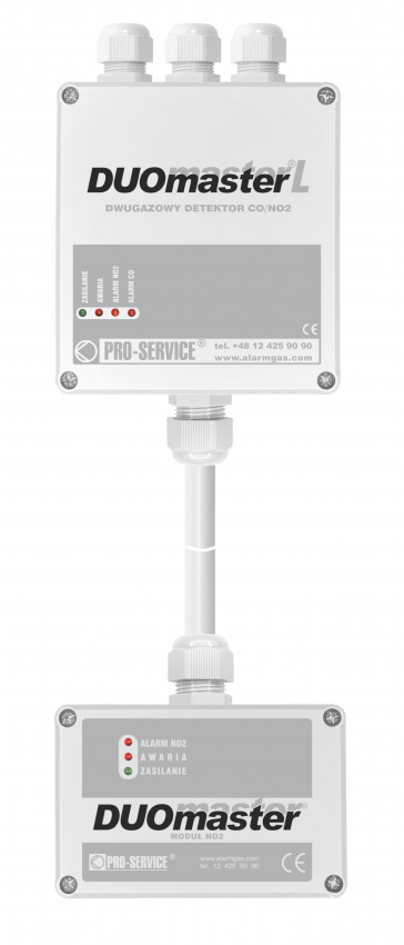 - DUOmaster CO/NO2 L /EE/D/RS485 – czujnik CO elektrochemiczny, czujnik NO2 elektrochemiczny, wyjścia przekaźnikowe (typ NO), wyjście RS485 z protokołem Modbus RTU